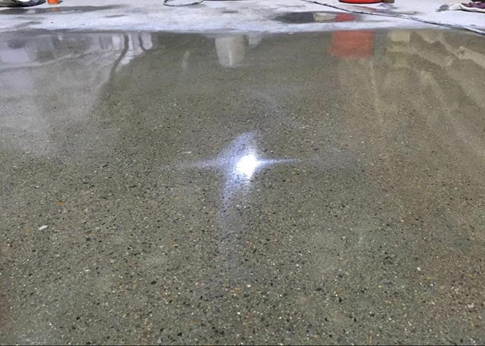 4、用專用磨機加水除去多余的密封固化劑(此時也可開磨一道),并吸干,等地面干透(最少8-12個小時) 。在己施用密封固化劑地面上,噴灑密封固化劑二遍于施工地面上,并用拖把或膠掃把拖勻保證藥劑在地面上均勻,使密封固化劑保持表面濕潤約2小時,同時用水保持表面濕潤及均勻使之充分滲透。