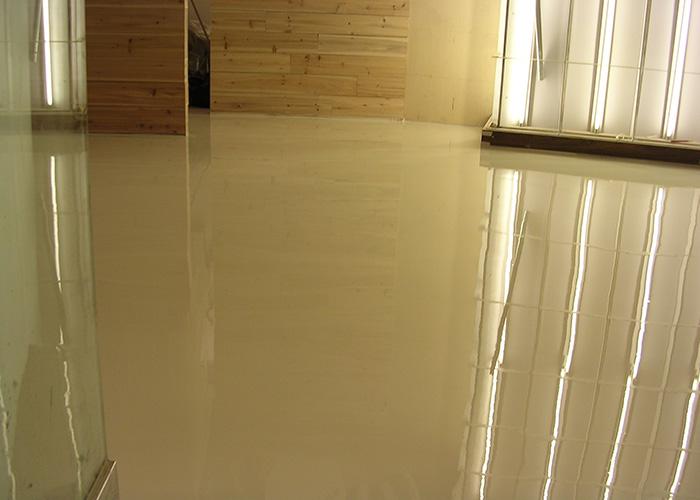 6.3 將攪拌好的流態(tài)自流平材料在可施工時(shí)間內(nèi)傾側(cè)到基面上, 任其象水一樣流 平開。應(yīng) 傾側(cè)成條狀,并確?,F(xiàn)澆條與上一條能流態(tài)地融合在一起。
