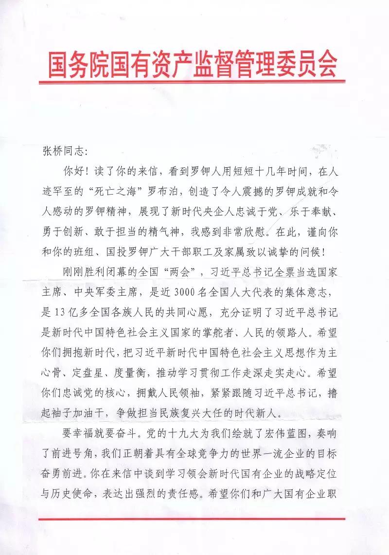 我是國(guó)投新疆羅布泊鉀鹽有限責(zé)任公司的一名普通的85后員工。前幾天,通過(guò)“國(guó)資小新”微信看到了您在接受《求是》雜志專訪的《新時(shí)代國(guó)有企業(yè)的戰(zhàn)略定位與歷史使命》文章,受益匪淺。您的思考,通篇貫徹著習(xí)近平新時(shí)代中國(guó)特色社會(huì)主義思想,為我們講述了新時(shí)代國(guó)有企業(yè)的戰(zhàn)略定位、歷史使命和改革發(fā)展的新目標(biāo)新舉措,不僅解開(kāi)了我們基層員工的一些思想困惑,也指明了我們國(guó)企未來(lái)的發(fā)展方向。所以,就想通過(guò)寫(xiě)信的方式和您交流一下學(xué)習(xí)心得。