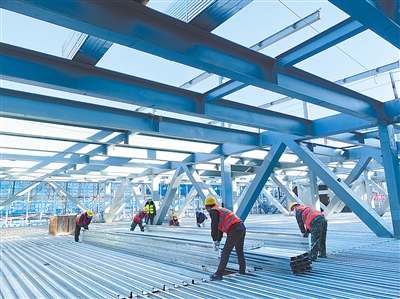 國(guó)家體育館2022北京冬奧改建項(xiàng)目施工現(xiàn)場(chǎng),中建二局的工人正在搬運(yùn)頂棚安裝材料。