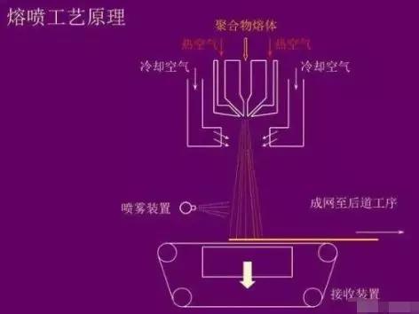 顧名思義,熔噴布是“噴”出來的。采用高速熱空氣流對模頭噴絲孔擠出的聚合物熔體細流進行牽伸,由此形成超細纖維并收集在凝網簾或滾筒上,同時自身粘合而成。