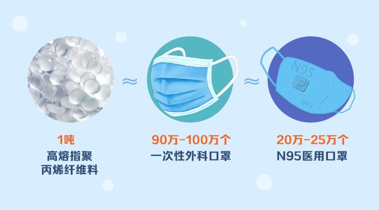 從總體、長期來看,我國的聚丙烯產能非常夠。中國石化、中國石油和國家能源集團是目前國內聚丙烯最主要的生產企業。根據相關數據,2019年,中國聚丙烯產能2549萬噸,產量為2096.3萬噸,約占全球30%。其中,可用于口罩熔噴布生產的高熔指纖維產量占總量的4.2%,為88萬噸。而一噸聚丙烯可生產一次性醫用外科口罩90萬到100萬只,生產N95醫用防護口罩則大約20萬到25萬只。總體產能遠遠大于口罩所需用量。