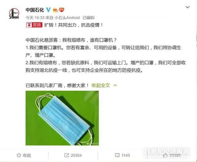 2月6日下午16時33分,中國石化發出“英雄帖”《我有熔噴布,誰有口罩機》。2月7日中午,中國石化就與合作伙伴對接完成11條口罩生產線。3月3日起,中國石化在北京50座加油站開始銷售的“納通”牌口罩,就是與民營企業北京納通科技集團有限公司合作生產的。中國石化提供原料的協作企業口罩日產量達到105萬只。