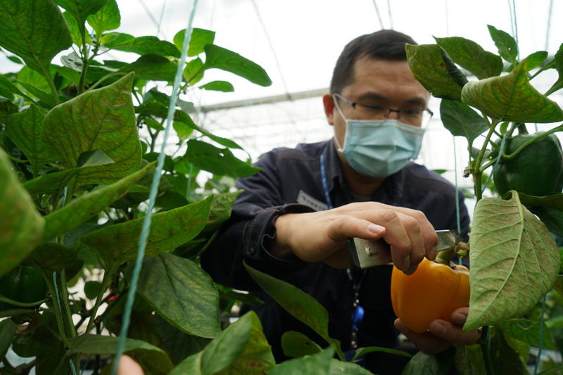 受疫情影響,扶貧彩椒滯銷,高鋒一邊幫村民收摘彩椒,一邊和村名一起想辦法解決難題。譚茂茜 攝