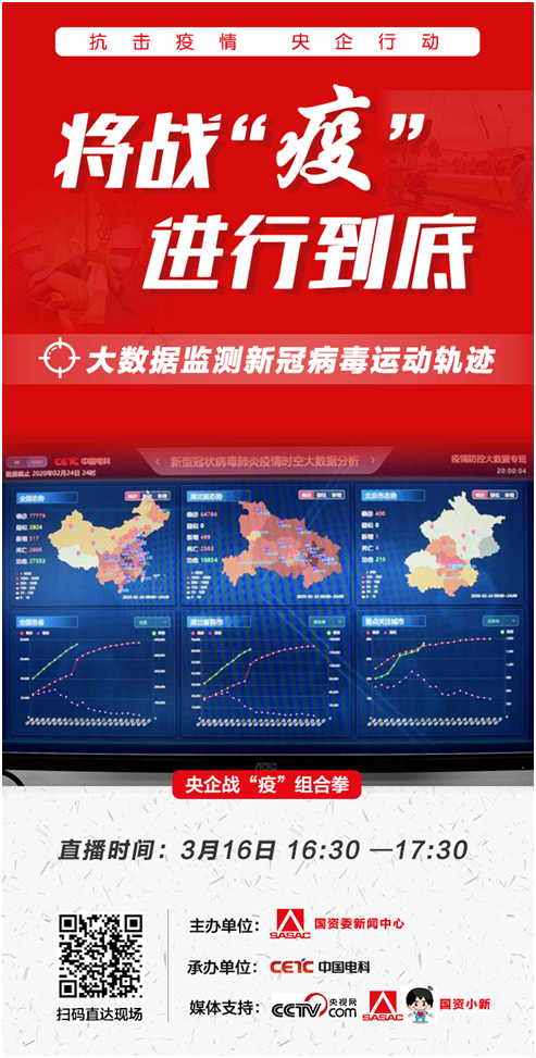3月16日16:30-17:30,《央企戰疫組合拳》特別直播節目揭秘“大數據監測新冠病毒運動軌跡”,展示中國電科集團的雙光跟蹤指示型測溫設備,連線北京西站、上海地鐵以及生產企業,向網友介紹這一神奇的智能檢測體溫儀真實應用場景。同時還將揭秘“密切接觸者測量儀”的研制生產過程,解惑技術特點以及民眾關心的個人隱私保障問題。