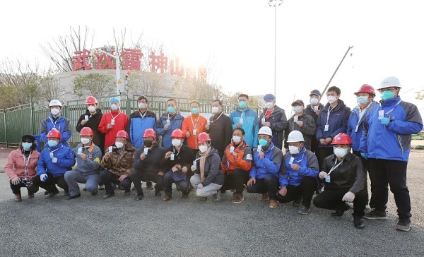 2月20日,被授予“雷神山醫院榮譽員工”的中建三局、中南建筑設計院等參建單位員工在雷神山醫院前合影留念。