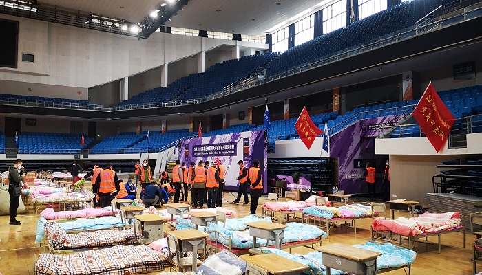中國一冶突擊隊火速建設武漢洪山體育館“方艙醫院”。