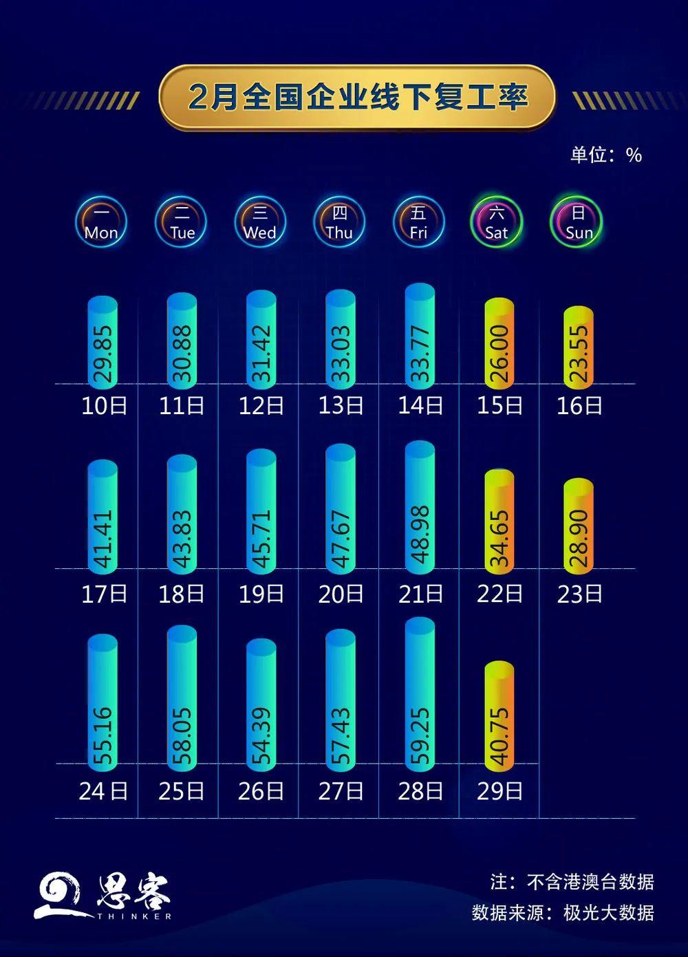 經(jīng)濟(jì)發(fā)展“動(dòng)起來(lái)”,2月10日以來(lái),全國(guó)企業(yè)線下復(fù)工率平均每周提升10%。思客聯(lián)合極光大數(shù)據(jù),對(duì)約10億條人口遷徙數(shù)據(jù)進(jìn)行分析,結(jié)果顯示全國(guó)企業(yè)總體復(fù)工率由復(fù)工第一周的30%,上升至第三周的50%以上。