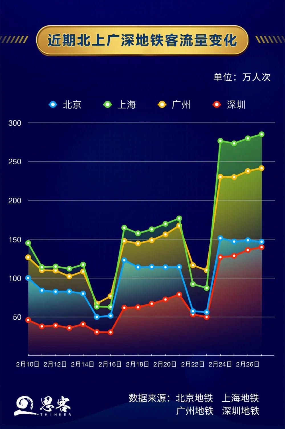 北上廣深地鐵客流量呈階梯式增長(zhǎng),四座城市正在錯(cuò)峰、有序復(fù)工。2月10日以來(lái),北上廣深四城工作日地鐵客流量與周末客流量有明顯差距,每周客流人數(shù)較上周均有所增多,其中周一形成了人流“小高峰”。雖受遠(yuǎn)程辦公、地鐵限流、暫停尾號(hào)限行等影響,客流量與春節(jié)前相比仍有差距,但可以預(yù)測(cè),四座城市的地鐵客流量將隨著復(fù)工率的提升逐漸增多。
