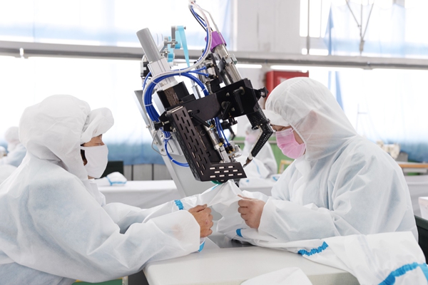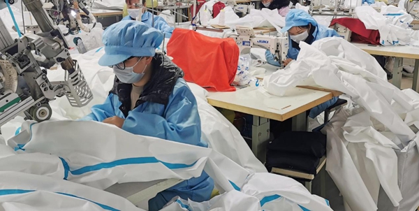 圖為國機集團所屬蘇美達創(chuàng)思特公司緊急轉(zhuǎn)產(chǎn)醫(yī)用防護服,緊鑼密鼓進行生產(chǎn)。國機集團/供圖