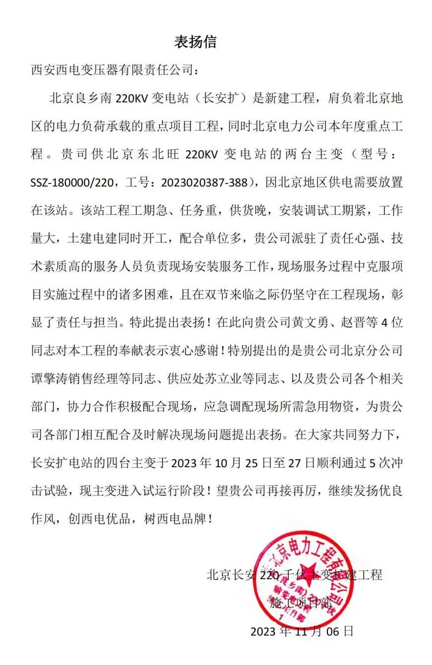 近日,西電西變收到一封來自北京電力工程有限公司北京良鄉南220KV(長安擴)變電站項目部的表揚信,信中對譚擎濤、黃文勇、趙晉等6人為該項目的艱辛付出提出表揚。