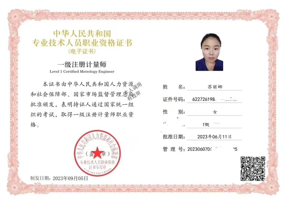 計量員自學(xué)一級注冊計量師知識,順利通過全國專業(yè)技術(shù)人員職業(yè)資格考試,于2023年9月5日取得一級注冊計量師證書,為此次計量標(biāo)準(zhǔn)復(fù)審人員新要求提供了硬件支撐。