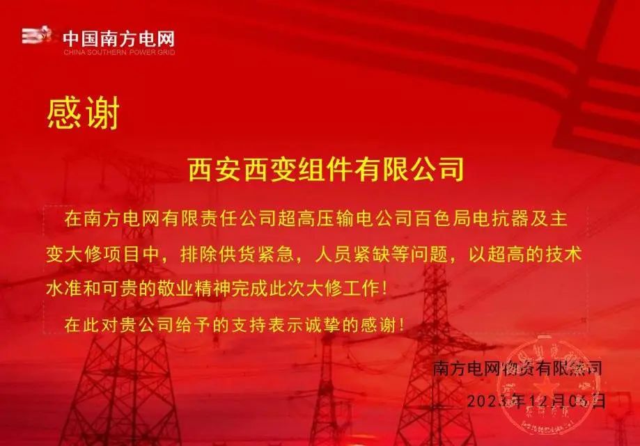 近日,西變組件收到南方電網物資有限公司感謝信。信中對西變組件在南方電網有限責任公司超高壓輸電公司百色局電抗器及主變項目中,排除供貨緊急、人員緊缺等問題,以超高的技術水準和可貴的敬業精神完成此次工作,表示認可與感謝。
