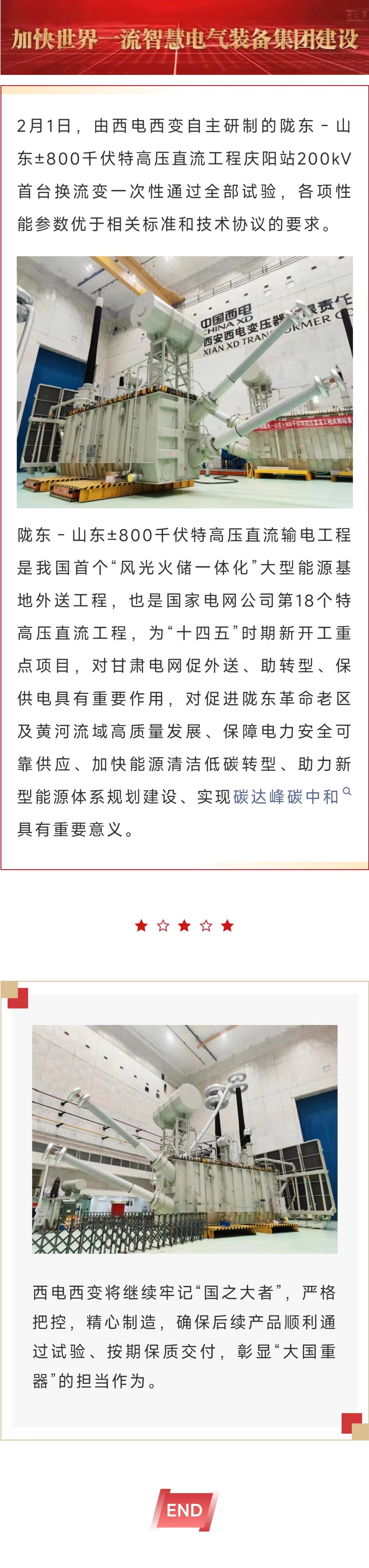 喜報丨西電西變自主研制的隴東-山東±800千伏特高壓直流工程慶陽站200kV首臺換流變一次性通過全部試驗