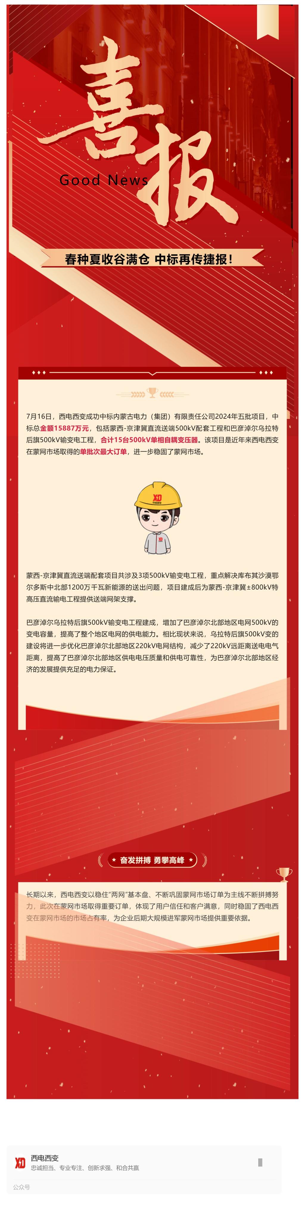 喜報丨西電西變成功中標內蒙古電力(集團)2024年固定資產投資項目