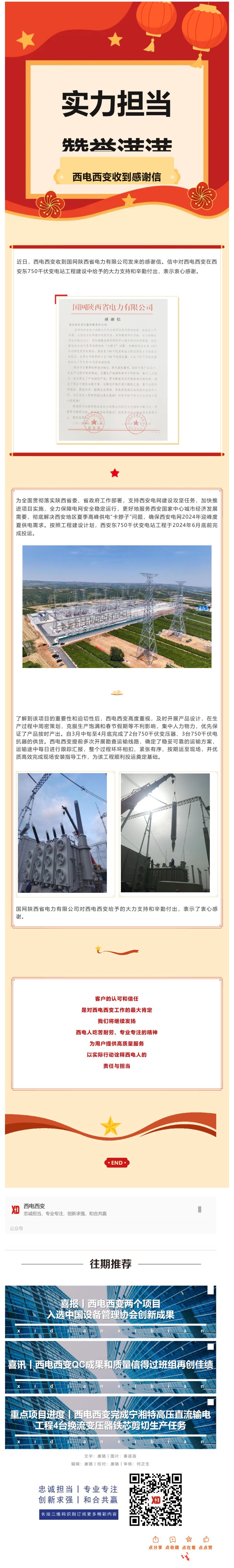 贊譽滿滿丨西電西變收到國網陜西省電力有限公司發來的感謝信
