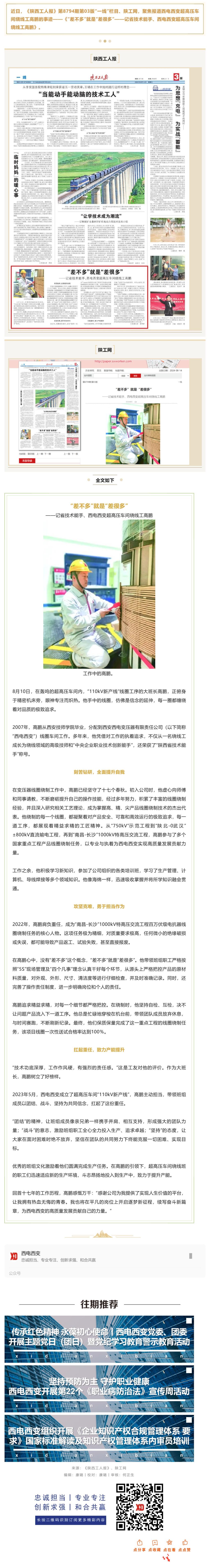 媒體聚焦丨《陜西工人報》:“差不多”就是“差很多”——記省技術能手、西電西變超高壓車間繞線工高鵬