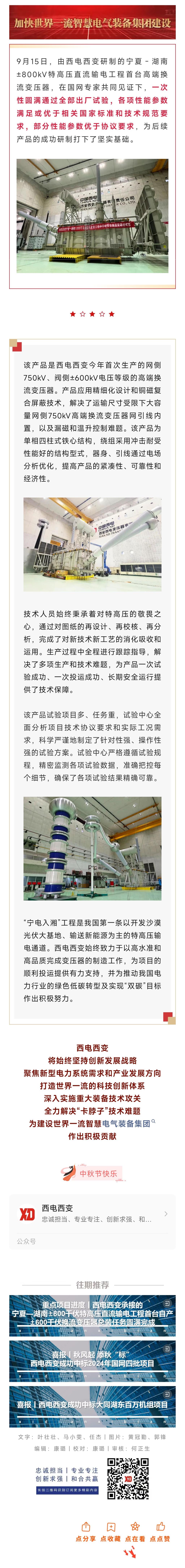 喜報丨西電西變研制的寧夏-湖南±800kV特高壓直流輸電工程首臺高端換流變壓器一次性通過全部試驗