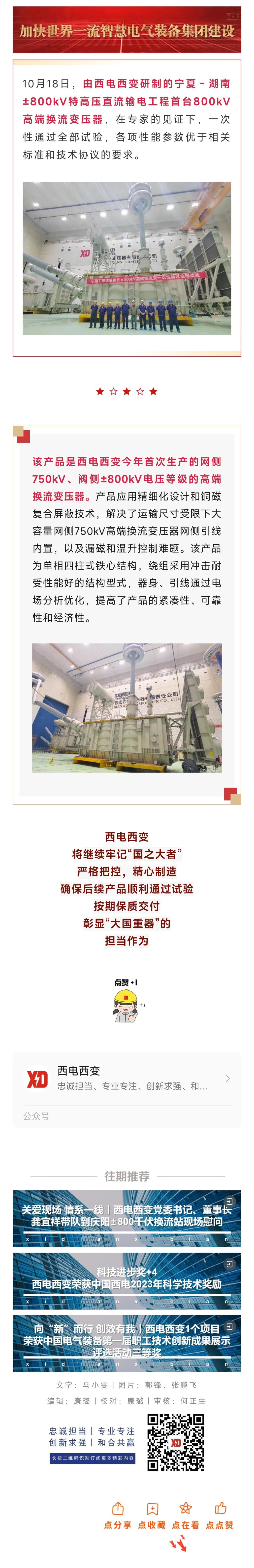 喜報丨西電西變研制的寧夏-湖南±800kV特高壓直流輸電工程800kV首臺高端換流變壓器一次性通過全部試驗