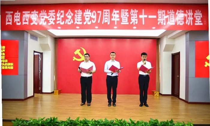 為紀念偉大的中國共產黨成立97周年,西電西變于6月29日上午舉辦了以“不忘初心 牢記使命 勇于擔當 主動作為”為主題的紀念建黨97周年暨道德講堂活動,西電西變黨委委員、黨群部門負責人、各黨支部書記、部門主要負責人、受表彰的黨員代表等100余人參加活動。